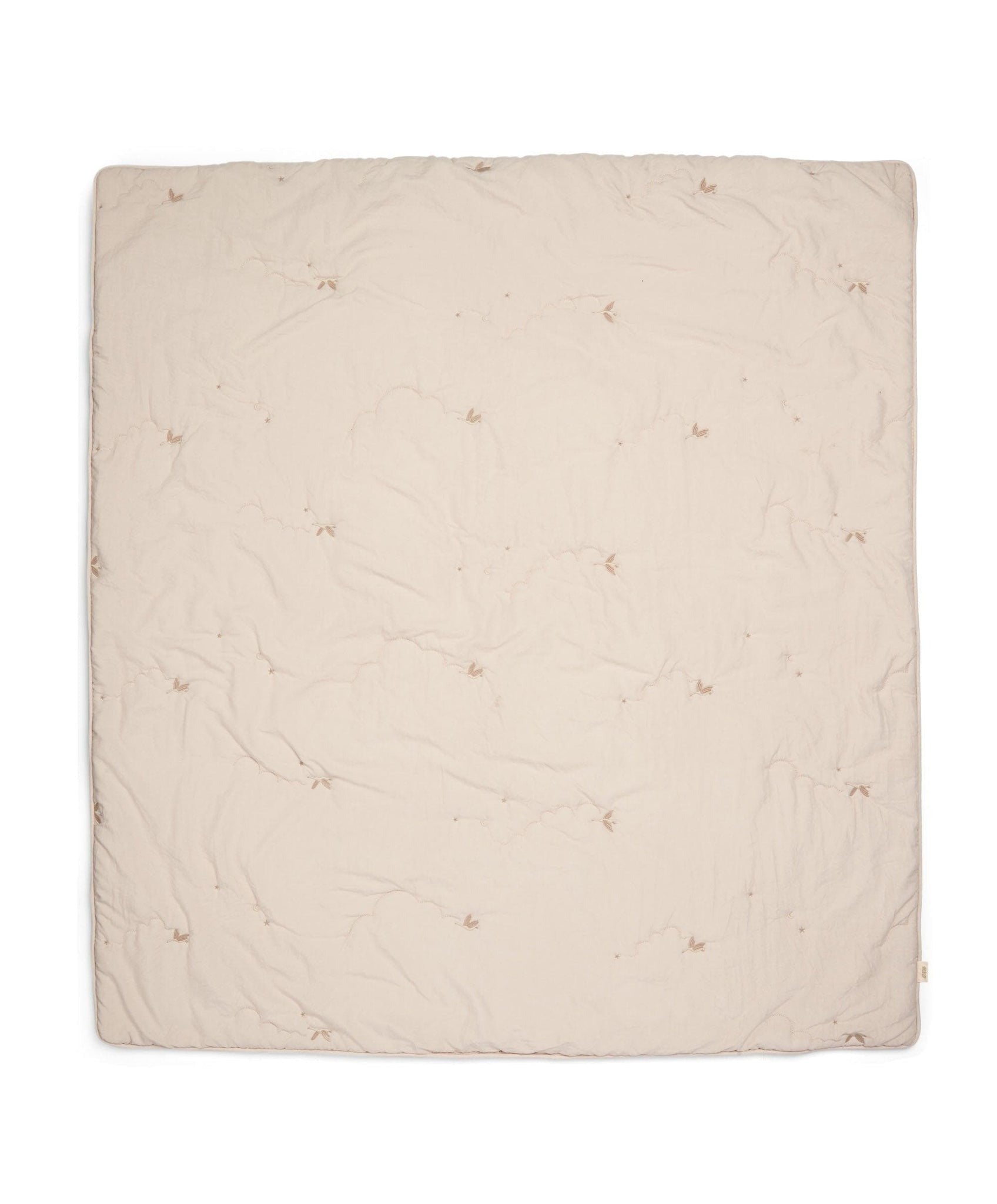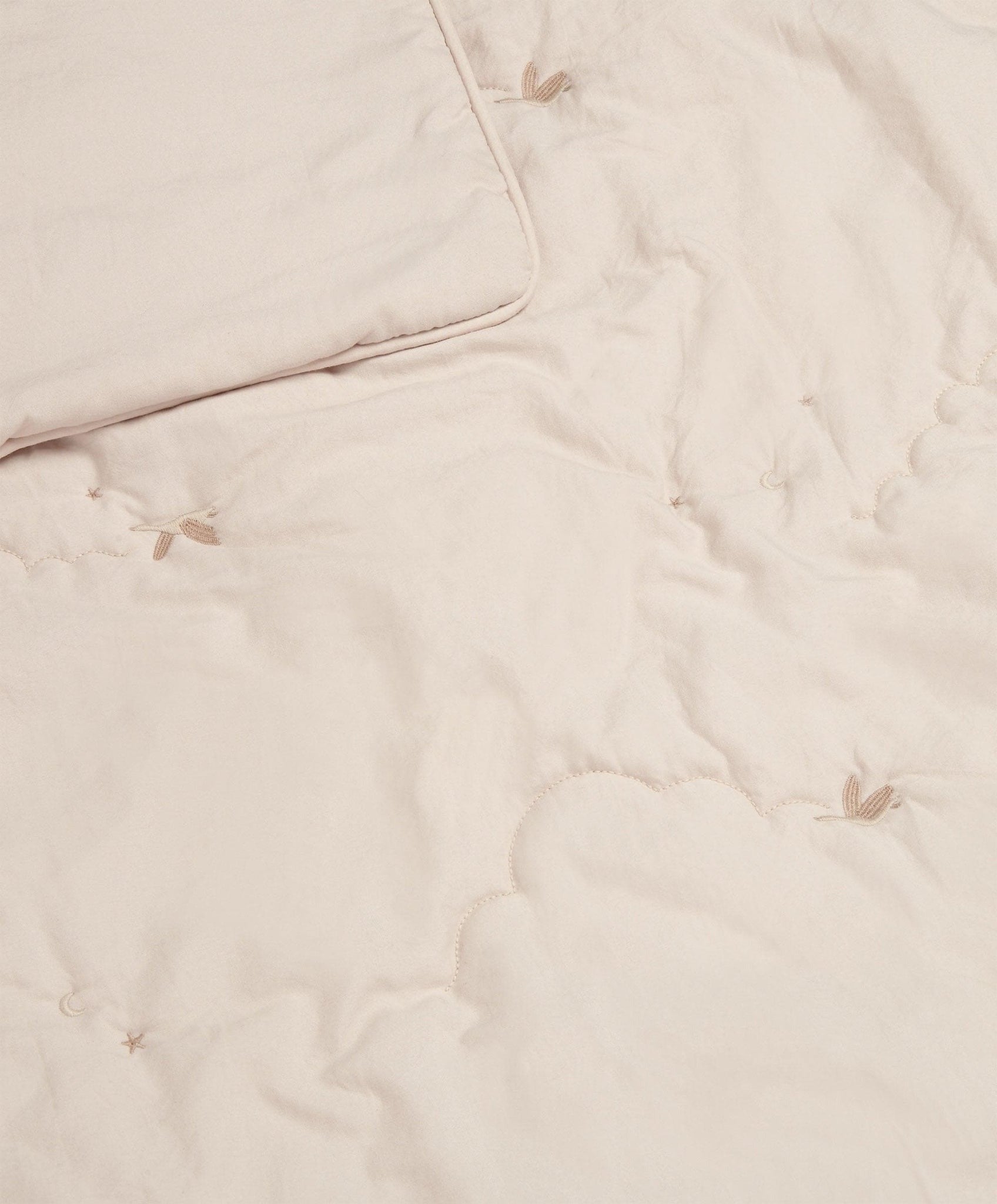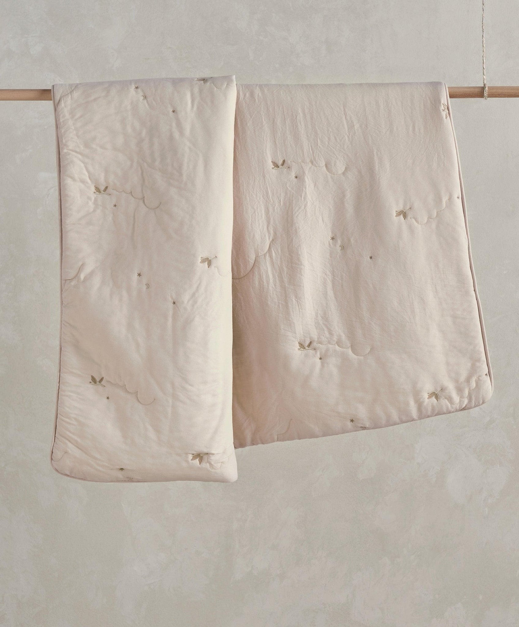 A soft, lofty laundered-feel 4.0 Tog quilt with delicate cloud quilting and 'flying duck' embroidery. With a neutral base this quilt sits effortlessly in most nurseries, while the embroidered ducklings are signature to this range. Finished with deluxe piped edging