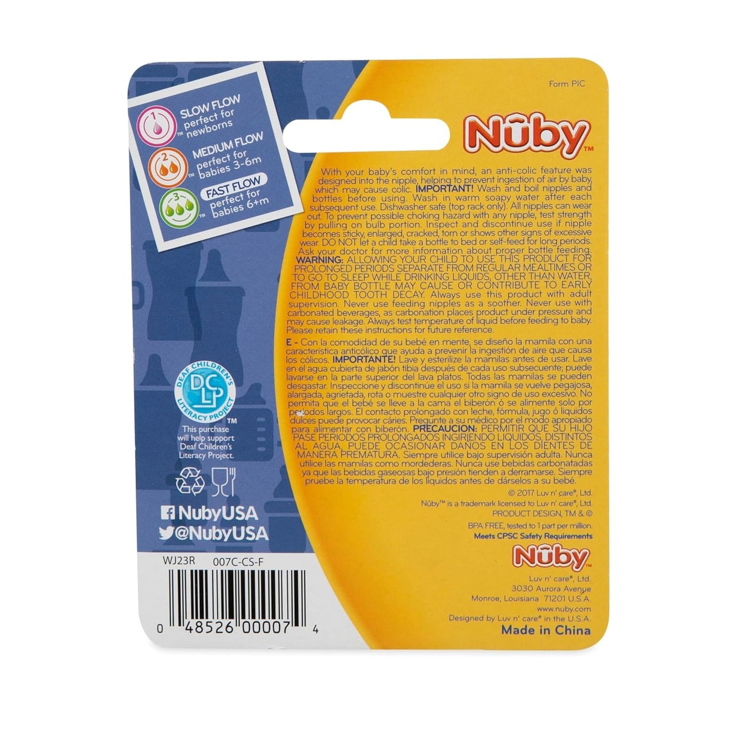 Nuby fast flow silicone nipples( 4 pack). Anti-colic air system prevents ingestion of air by baby. Soft and comfortable for baby's mouth. Fast flow has a large opening perfect for juice.
