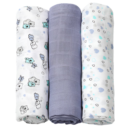 Bamboo fibre nappies can be used from the first days of life -as a swaddle, light blanket, changing pad, bed sheet or handy towel. They work especially well as a cover while breastfeeding or a shoulder pad protecting parent's clothing from posseting. They can also be used as a sleep cuddle, or light stroller cover. They are suitable for any situation requiring closeness to the baby's skin.