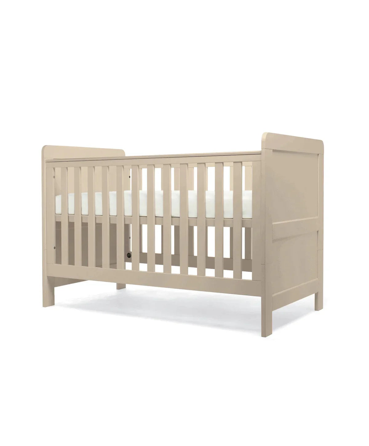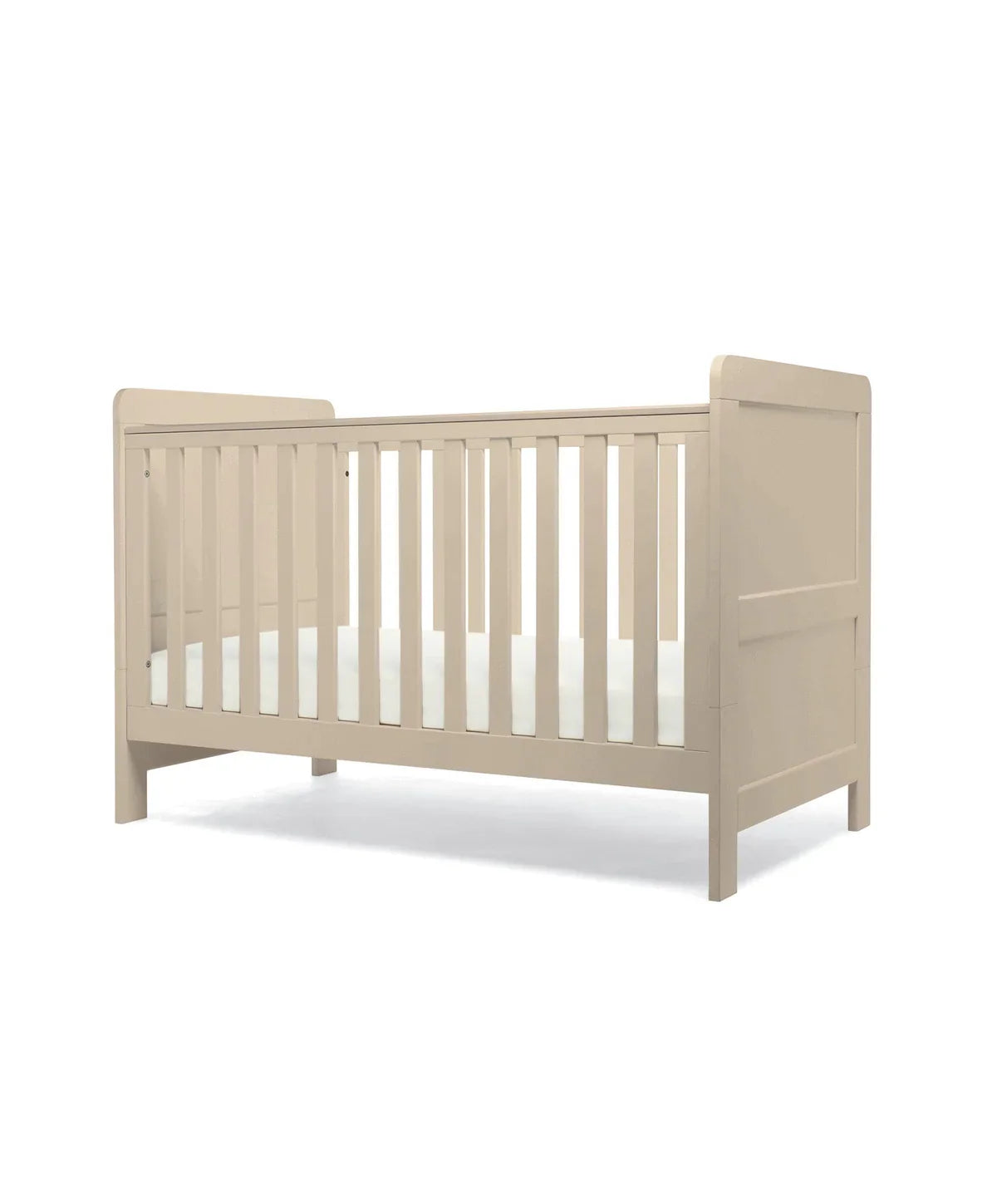 Cotbed with Hampden signature clean, minimalist design, in shade Cashmere, a soft neutral that pairs well with a range of interiors to offer a sophisticated and calming atmosphere. See baby from newborn into toddler years and beyond with this cotbed that converts easily from cot to toddler bed, With 3 adjustable cot base heights to ensure baby is safe as they grow bigger and become more mobile.