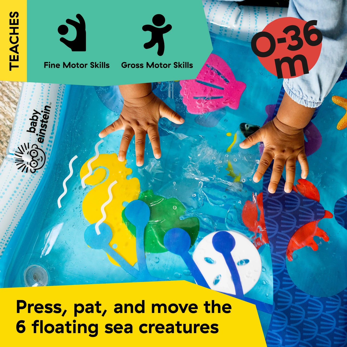 Under the sea exploration is at your baby’s fingertips with Opus’s Ocean of Discovery™ Tummy Time Water Mat, featuring Baby Einstein’s Opus the Octopus. Simply fill the center of the play mat with water and blow up the outer rim with air. During seated play and tummy time, baby can work on muscle development while making the 6 floating sea creatures and shapes move under the surface. Perfect for naturally curious kids ages newborn and up, this hands-on activity introduces cause and effect as they touch the mat and watch the underwater creatures swim. It helps to engage and entertain infants and toddlers while encouraging the development of gross motor skills. Cleanup is easy —just drain the water and air, wipe down the mat, and fold up for storage or travel. Use at home or take along for adventures so your baby can discover the wonder of water and sensory play wherever you go.