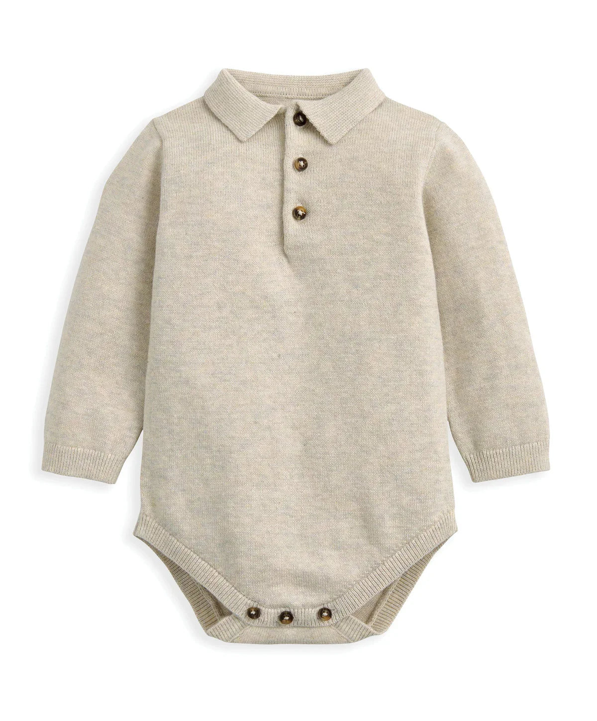- Long-sleeved, polo knit bodysuit with front button and popper gusset fastenings