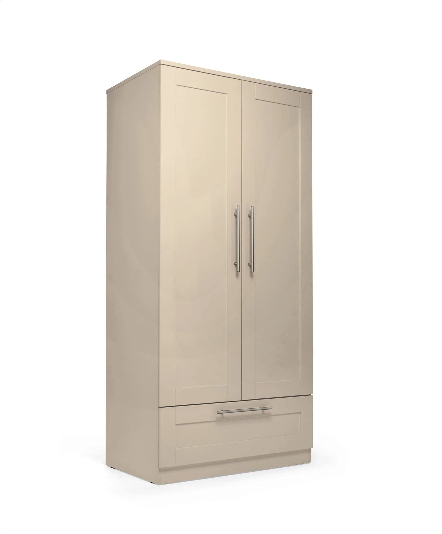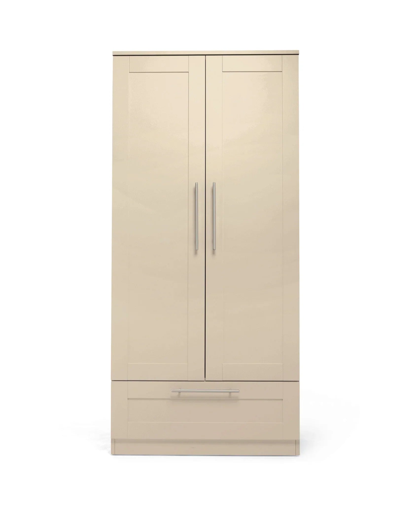 Hampden's double wardrobe in shade Cashmere, a soft neutral that pairs well with a range of interiors to offer a sophisticated and calming atmosphere. With chic metal handle details and a clean, minimalist design.