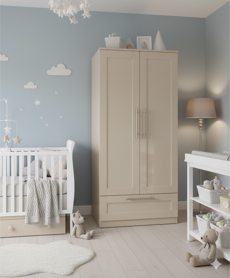 - Full sized wardrobe to fit baby and adult clothes with a removable rail.