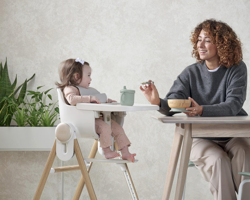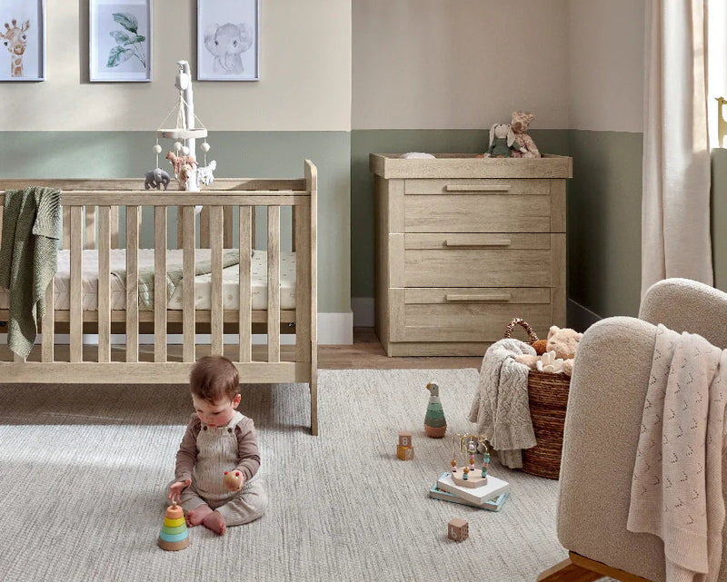 This elegant nursery furniture set blends natural wood with white for a timeless, modern look.