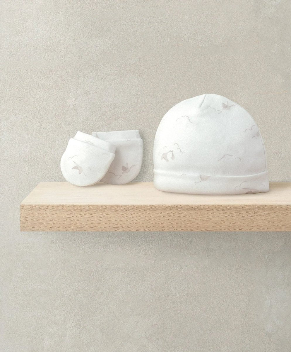 Premature baby hat and mitts set, in stork print. Made from gentle and soft 100% Cotton.