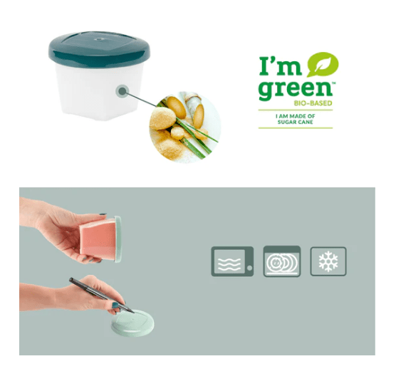 Baby food storage containers made from 97% plant-based material derived from sugar cane