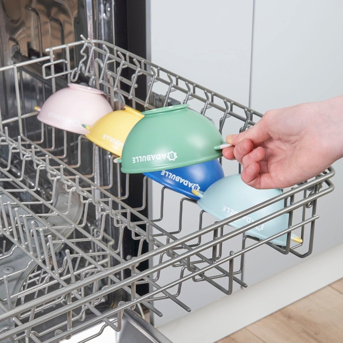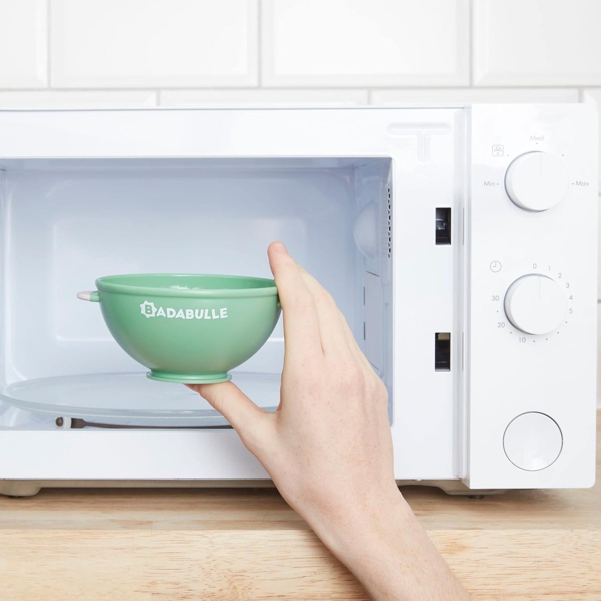 Thanks to the badabulle set of 5 non-slip bowls of 330ml and 3 spoons in pastel colors, you will be able to brighten up your little one's breakfasts, lunches, snacks or even dinners even more! a non-slip suction cup and 5 interchangeable hermetic lids allow you to complete the collection! you can use the bowls from your baby's first meals, thanks to the airtight lids these bowls turn into containers. super practical! thanks to the non-slip suction cup, it will be a bowl that will not end up on the floor! from baby's first real meals, you can use spoons that have a tip suitable for small mouths! the entire set is microwave and freezer safe!