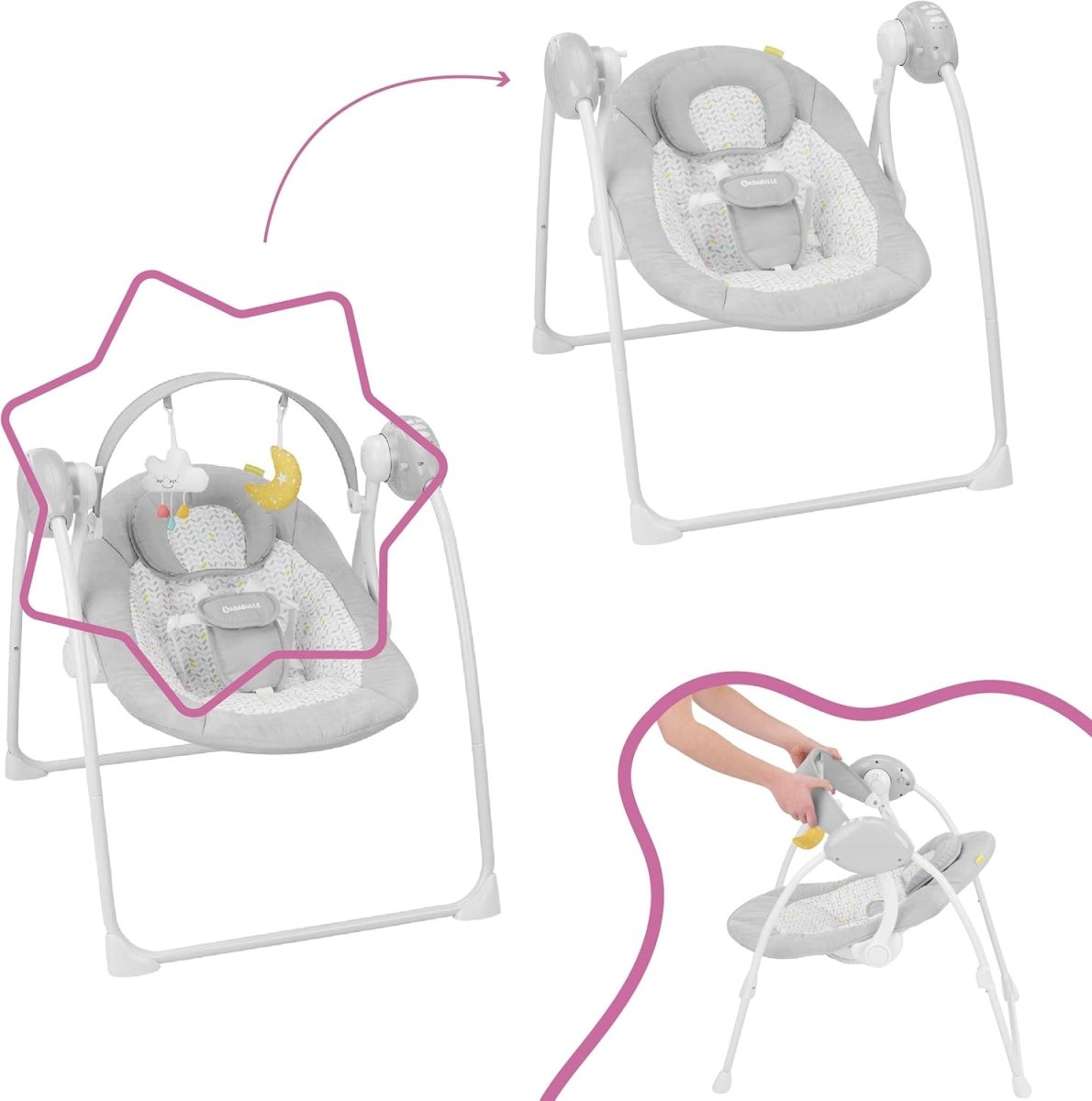 The compact comfort electric swing by Badabulle - for use from birth! 5 swing speeds Programmable timer: 8, 15 or 30 minutes 12 tunes with volume control Folds away for easy carrying and compact storage Soft and snug newborn cushioned liner Easy to wash (removable and machine-washable cover) Powered by 4 x AA batteries (not supplied) or mains adaptor Adjustable toy bar