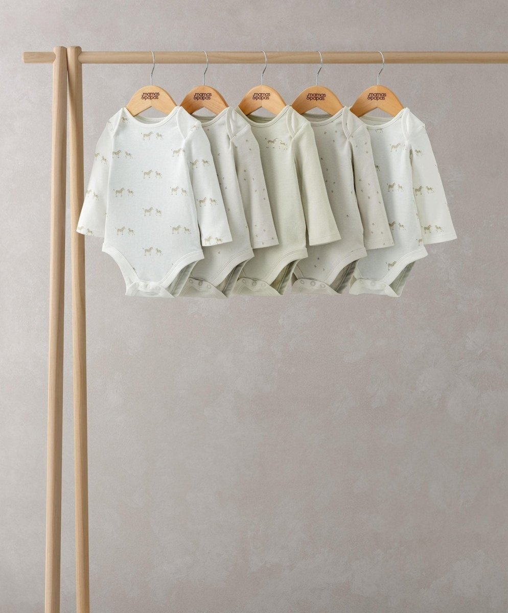 Handy 5-pack of 100% cotton long sleeve bodysuits in wild animals theme.