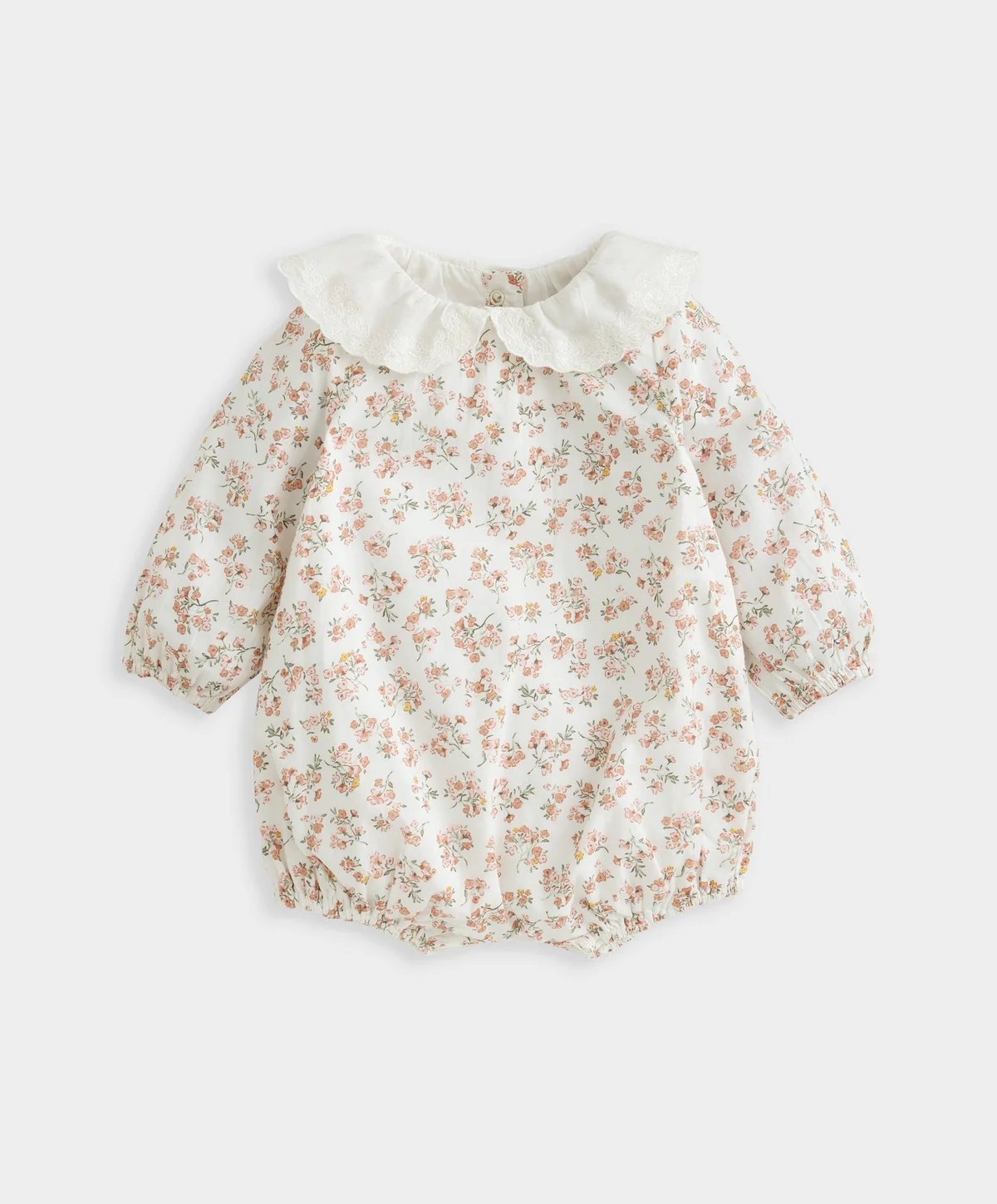 Wildflower cotton romper with peter pen embroidered broderie collar.