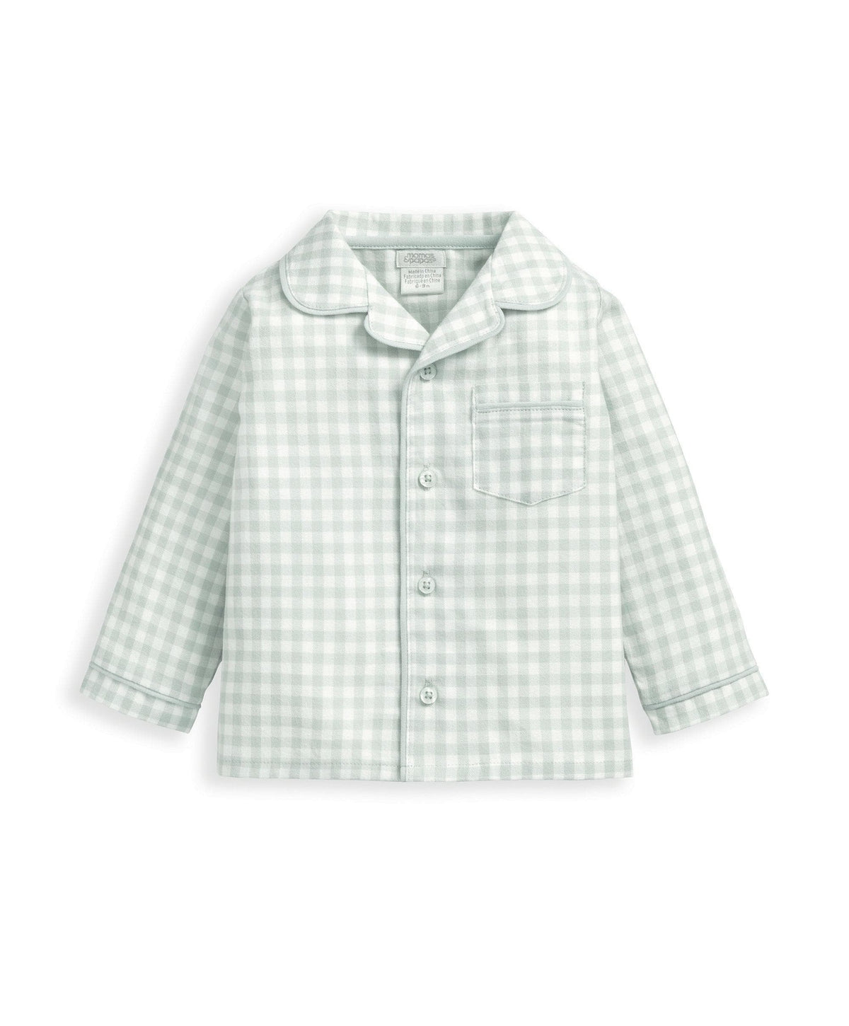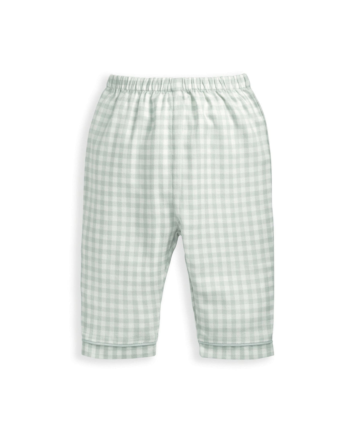 Soft cotton two-piece pyjamas set. Collared button front shirt with pocket detail. Trousers with elasticated waist for quick and easy changes. In a timeless blule/green and white gingham check pattern. 100% cotton is breathable, soft and gentle on skin.