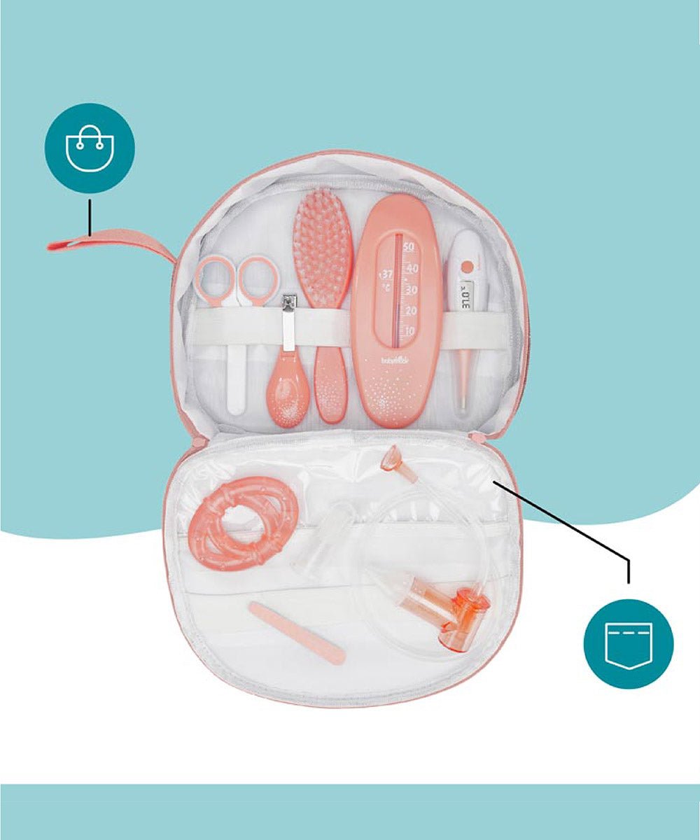 The Babymoov Complete Baby Care Kit is a comprehensive set designed to assist with your baby's daily care needs. It includes nine essential accessories: