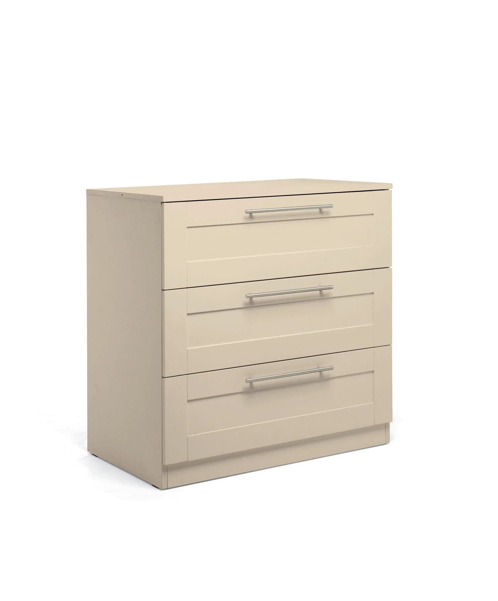 Hampden’s convertible dresser/changer in shade Cashmere, a soft neutral that pairs well with a range of interiors to offer a sophisticated and calming atmosphere. With chic metal handle details and clean, minimalist design. Removeable changing top allows you to use your dresser for years, once your little one is all grown up. With three deep drawers for maximum storage.