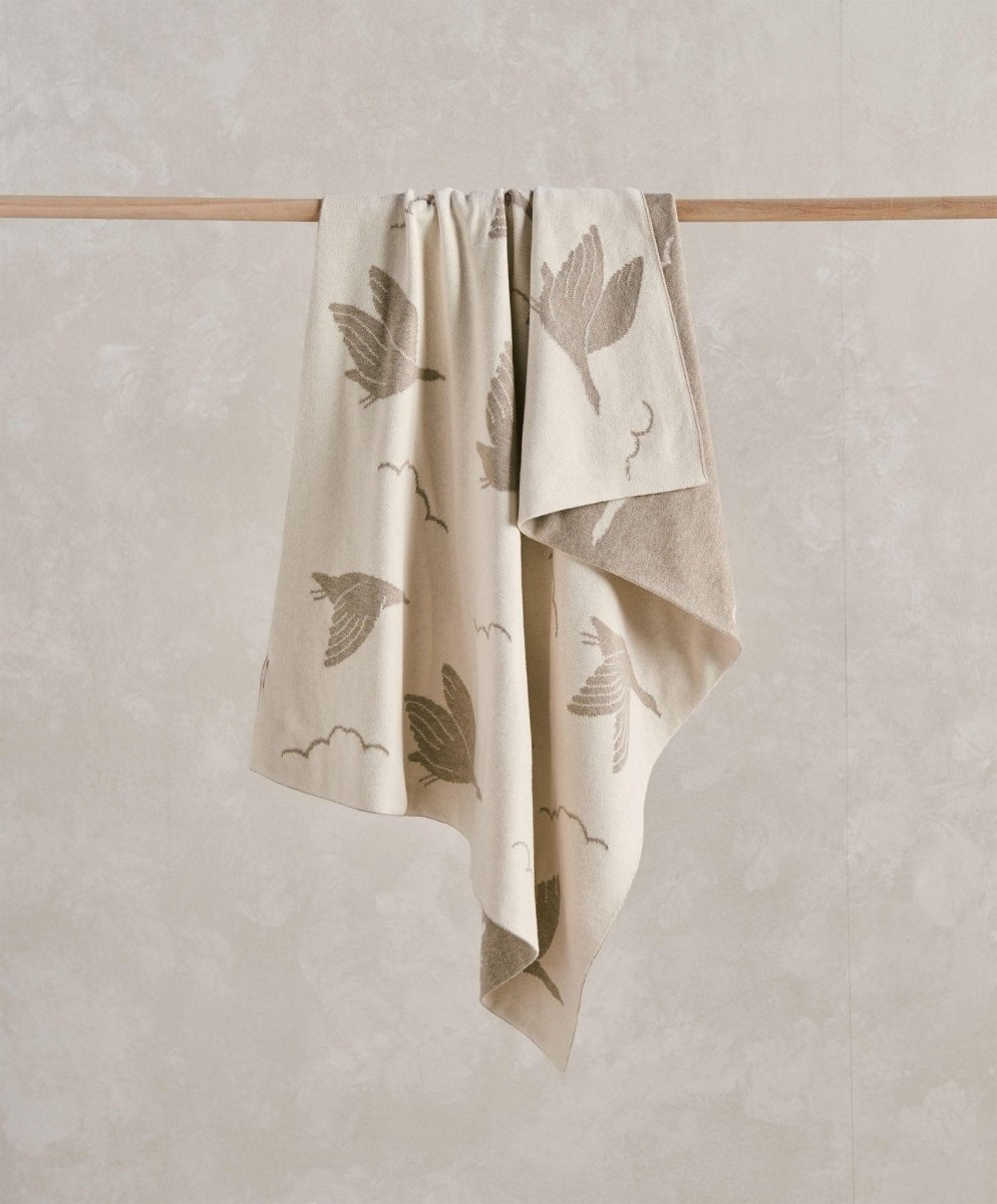 Couverture légère en coton tricoté. Brun moka avec silhouette de canard volant blanc cassé. Motif identique, couleurs opposées au verso. En coton ultra doux.