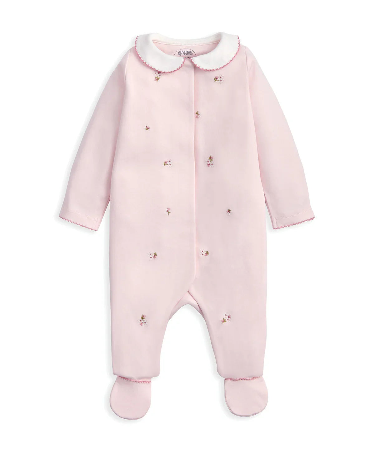 Barboteuse rose brodée avec col claudine et fermeture à bouton-pression, bonnet tricoté avec détails de broderie, couverture à imprimé floral sur toute la surface.