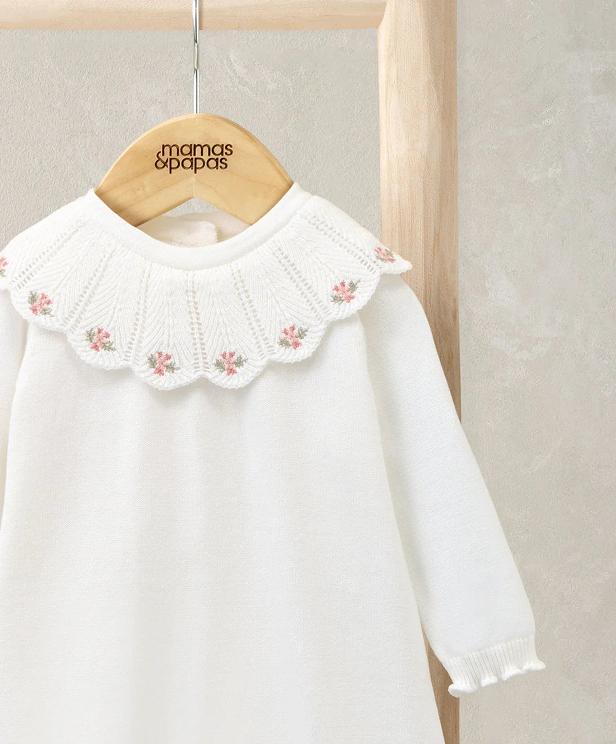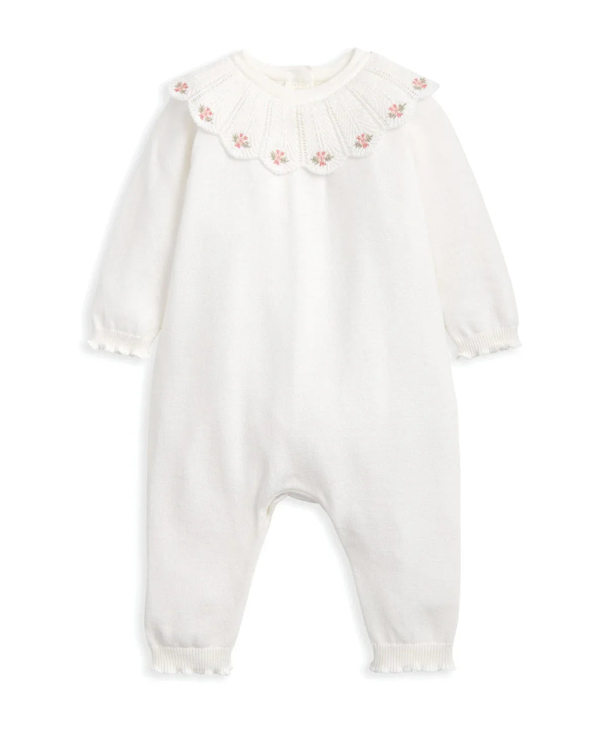 Une barboteuse magnifiquement détaillée avec une broderie florale complexe, parfaite pour les occasions spéciales.