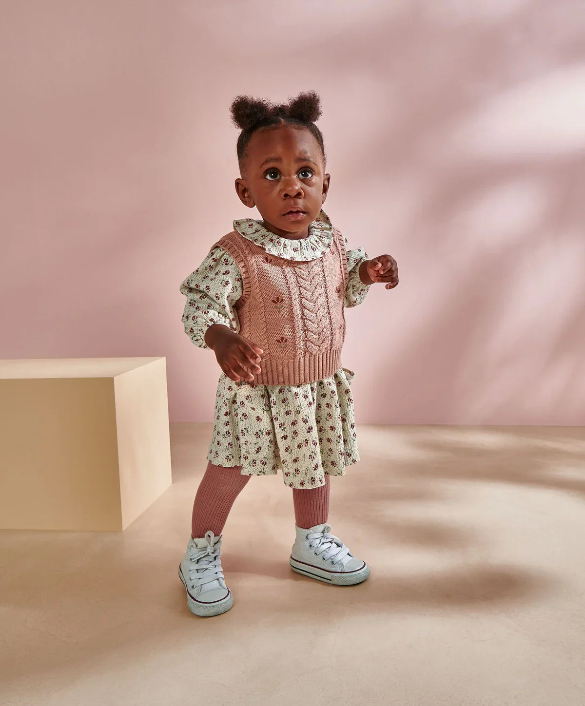 L'ensemble saisonnier le plus adorable pour votre tout-petit, comprenant une jolie robe à imprimé floral avec un gilet en tricot torsadé assorti.