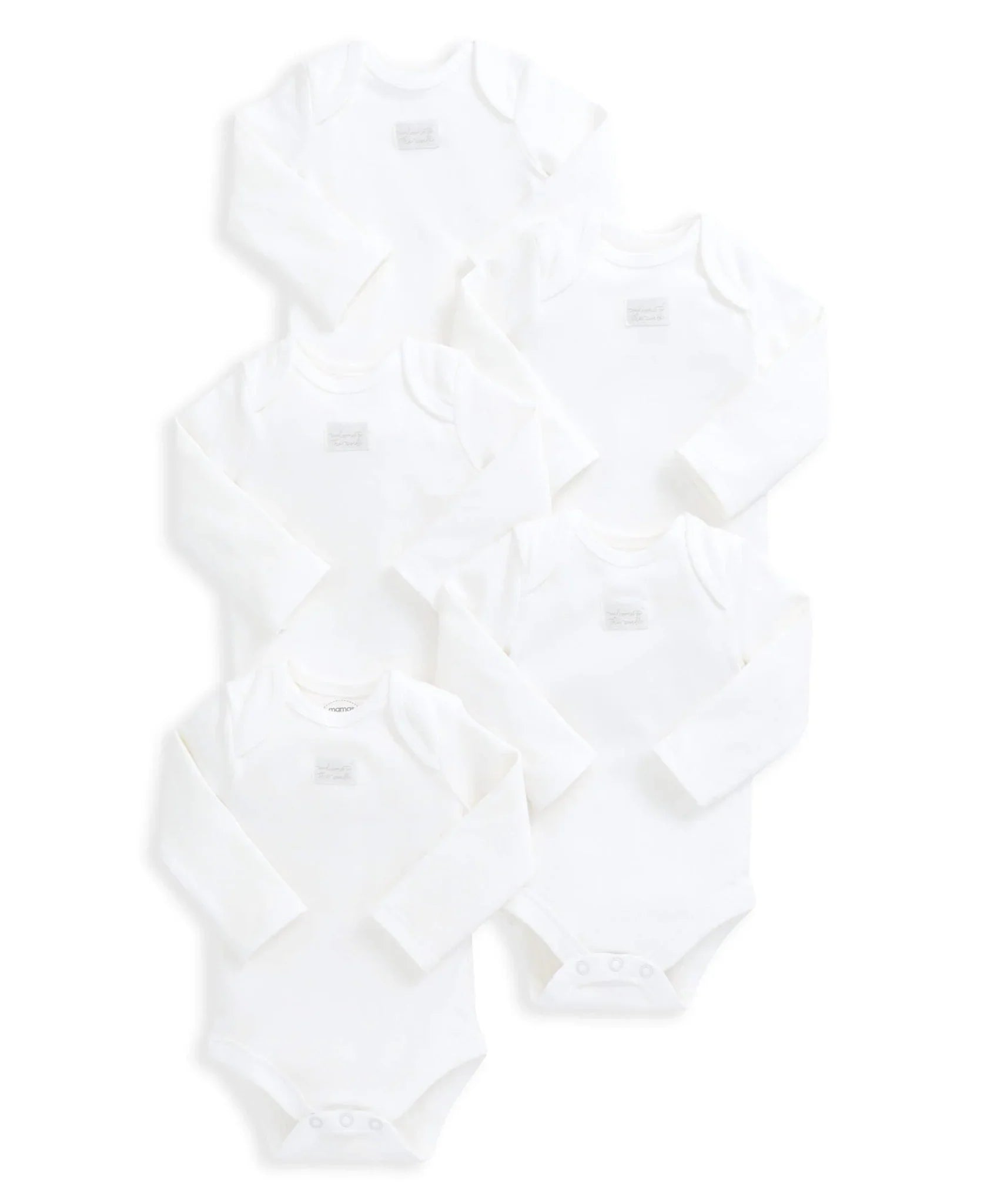 Lot pratique de 5 bodies à manches longues blanc pur en coton biologique ultra-doux, doux pour la peau du nouveau-né. Fermeture à boutons-pression pour un change facile et agrémenté d'un badge tissé « Bienvenue au Monde ».