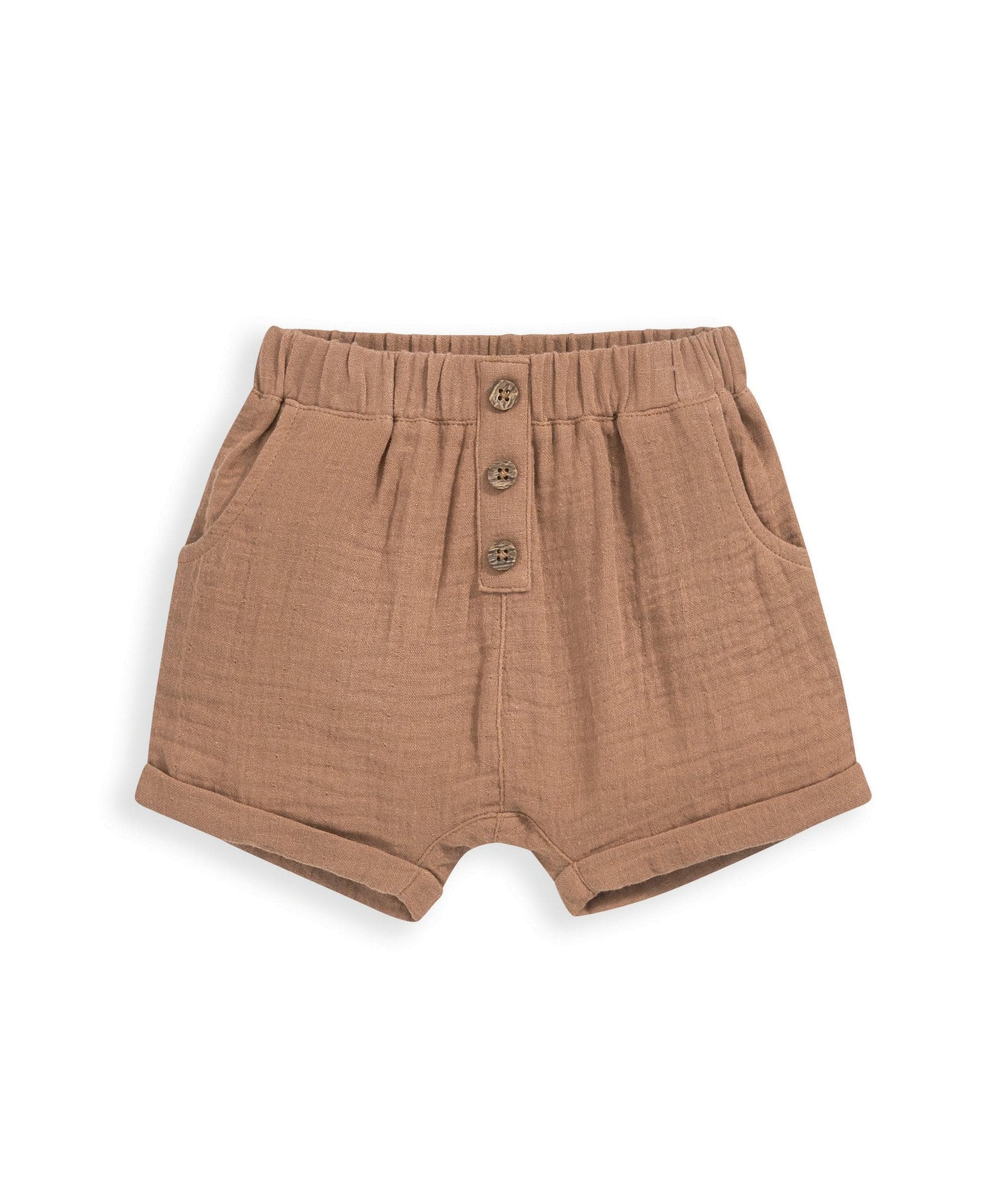 Short tissé pour garçon. Lien non fonctionnel. Grandes poches latérales plaquées. Taille élastiquée.