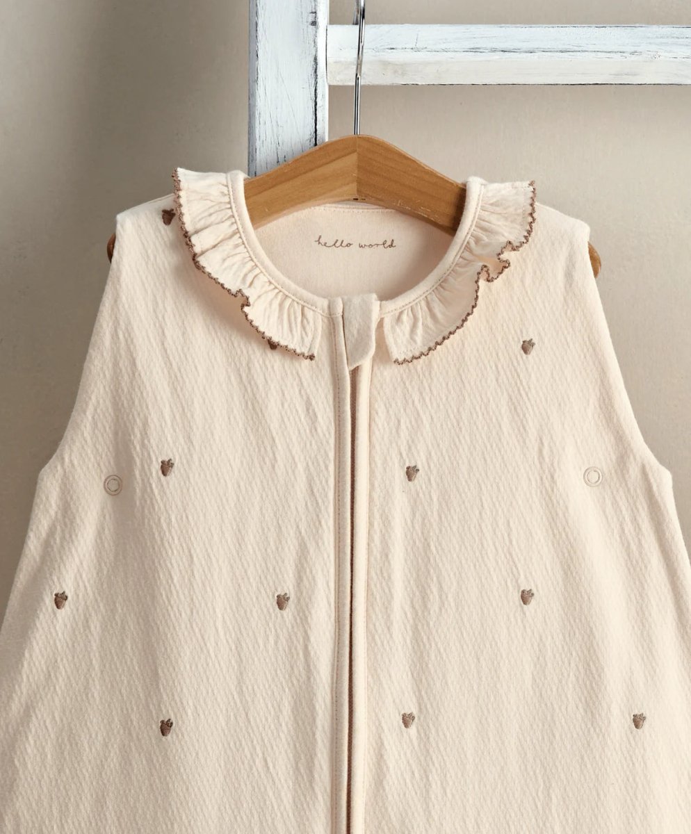 Dreampod texturé rose pâle, pour les 6 à 18 mois. Avec une délicate broderie fraise. Col à volants avec bordure picot contrastée. En jersey léger 1,0 Tog, idéal pour l'été.