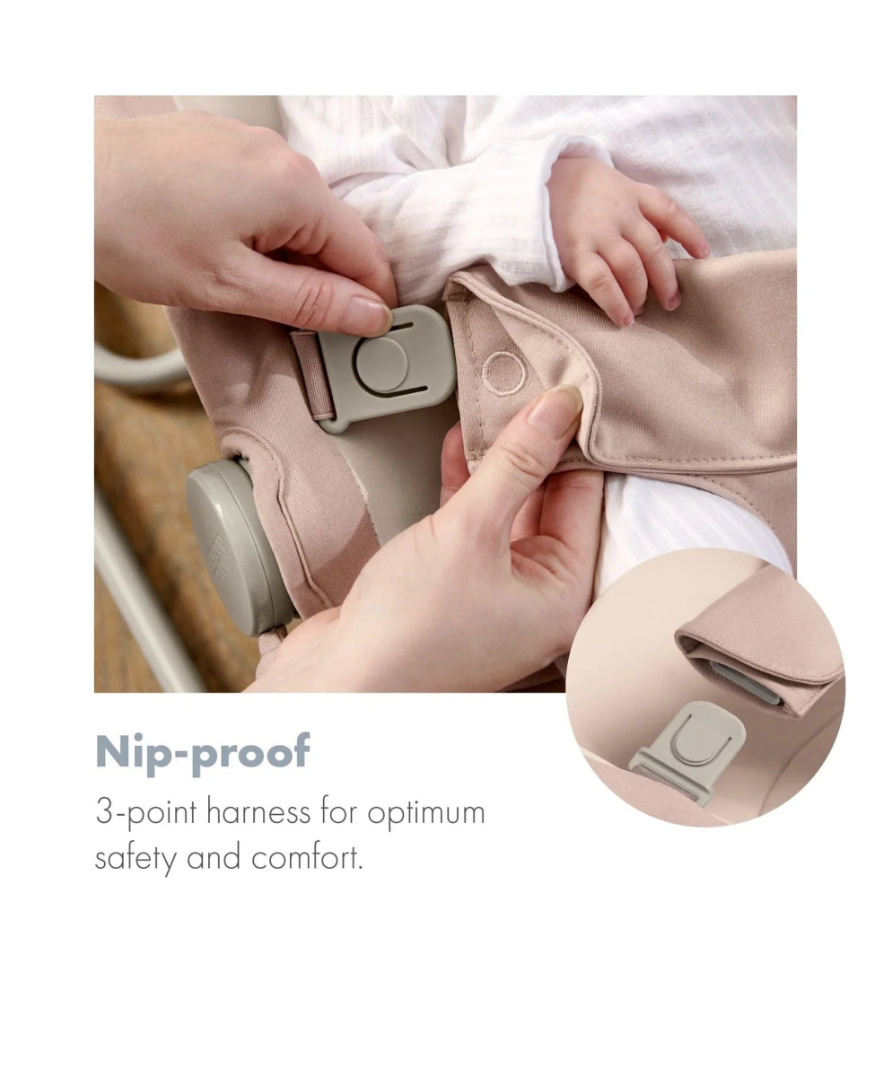 Adapté de la naissance à environ 6 mois, Tempo offre un endroit sûr et sécurisé pour asseoir votre bébé avant qu'il ne puisse se tenir assis ; une alternative confortable et protectrice au portage ; un endroit où il peut être apaisé, diverti ou interagir avec lui, selon vos besoins. La barre de jeu amovible se monte et s'abaisse facilement, vous permettant d'installer et de sortir bébé en douceur. Elle est fournie avec deux jouets d'éveil sensoriel pour plus de divertissement. Et vous pouvez avoir l'esprit tranquille : votre bébé est confortablement installé et en sécurité grâce au siège moelleux et confortable de Tempo, à son harnais 3 points anti-morsures et à son coussin protecteur pour la tête.